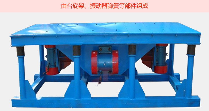 混凝土振動(dòng)臺(tái)主要由臺(tái)底架、振動(dòng)器彈簧等部件組成,臺(tái)面與底架均用鋼板和型鋼焊接而成,振動(dòng)臺(tái)是用電動(dòng)機(jī) 加一對(duì)相同的偏心輪組成。并通過一對(duì)吊架聯(lián)軸器安裝在臺(tái)面(反面)中心位置,起著振實(shí)過程中平穩(wěn)、垂直方向的作用。