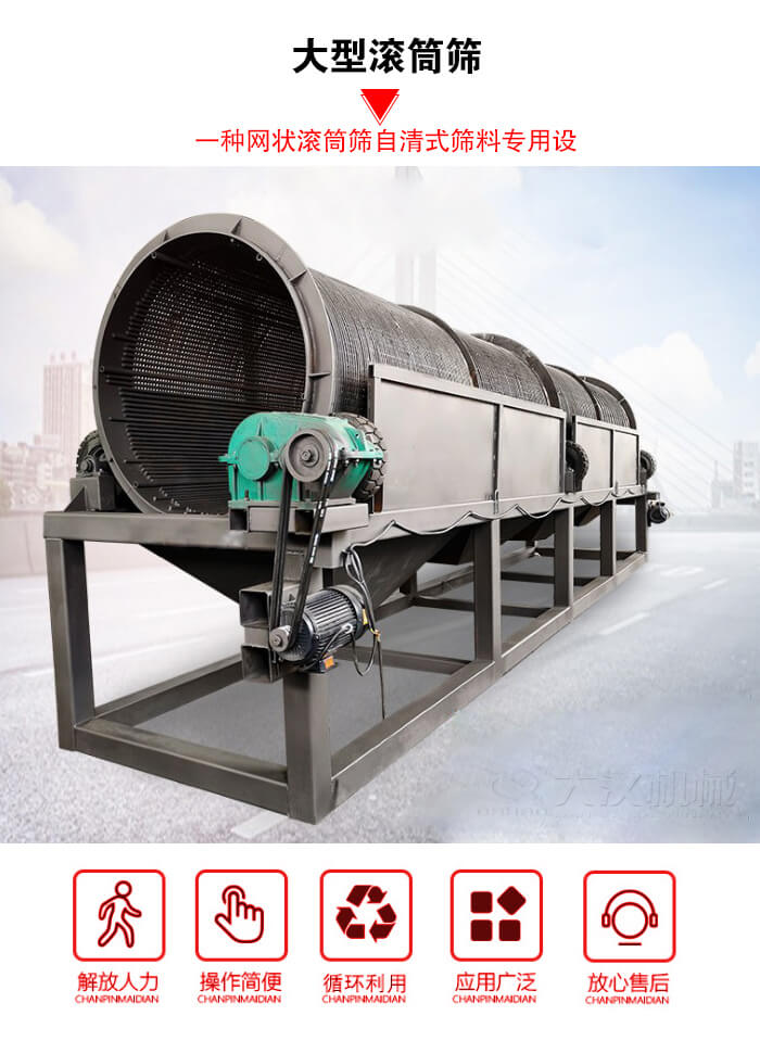 大型滾筒篩,因其獨特的結(jié)構(gòu)特點,完全有效地解決了其他型式篩分設(shè)備所存在的缺點,是綜合利用電站的篩型。是繼國內(nèi)各大公司生產(chǎn)的普通型網(wǎng)狀滾筒篩之后的自清式篩料專用設(shè)備。